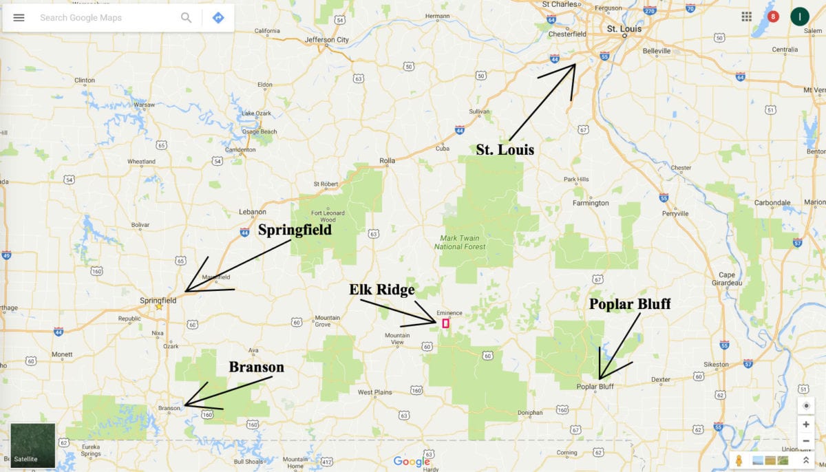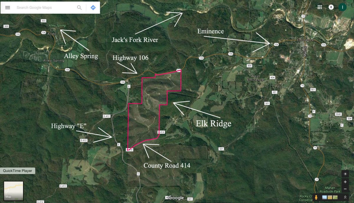 The property is located about 4 miles west of Eminence, Missouri. The property is private and secluded (with an amazing amount of wildlife) but is also within about 5 minutes of Eminence, Missouri. Even though this huge tract will keep you busy exploring, hunting and camping you may be interested to know that within 10 miles of the property you will find over 10,000 acres of National Forest and State Lands upon which you can also hunt, camp, trail ride and play!