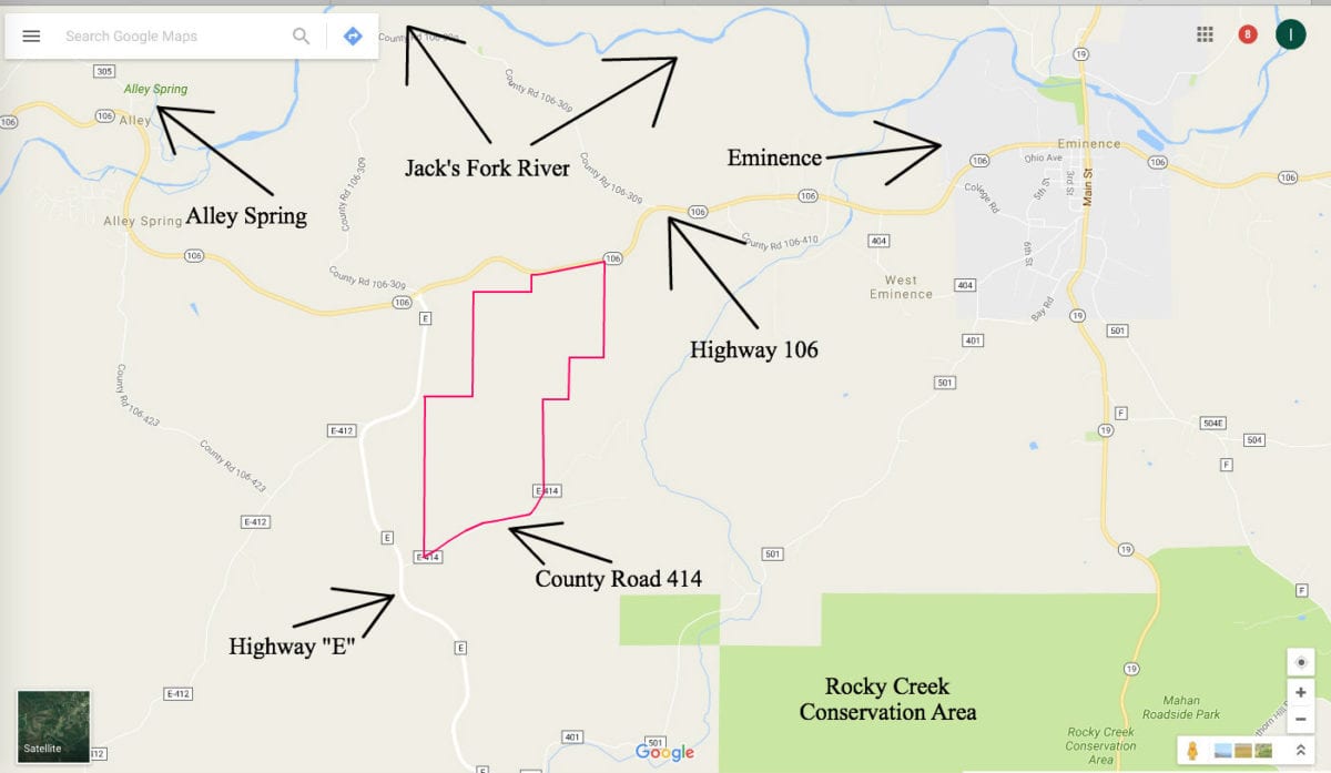 To get to the property from Springfield, Missouri just go east on Highway 60 to the town of Birch Tree. Keep going east past Birch Tree for a few miles and then go north (left) onto Highway E. Stay on Highway E for about 11 miles and then go east (right) onto Highway 106. Proceed about a mile to the property which will be on the south side (right side) of the road.