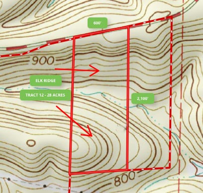 Above is a topo map of Tract 12 with approximate property boundaries. The property slopes down fairly steeply off of the Highway (as you go south). The property then slopes back up to a ridge area on the south side of the property (amazing views) which could be an excellent spot for a large campsite or for building a cabin. The trails which run through Elk Ridge will be helpful in accessing the different areas on the property. The blue line on the topo map is the little creek which crosses over the property (may not flow year around).