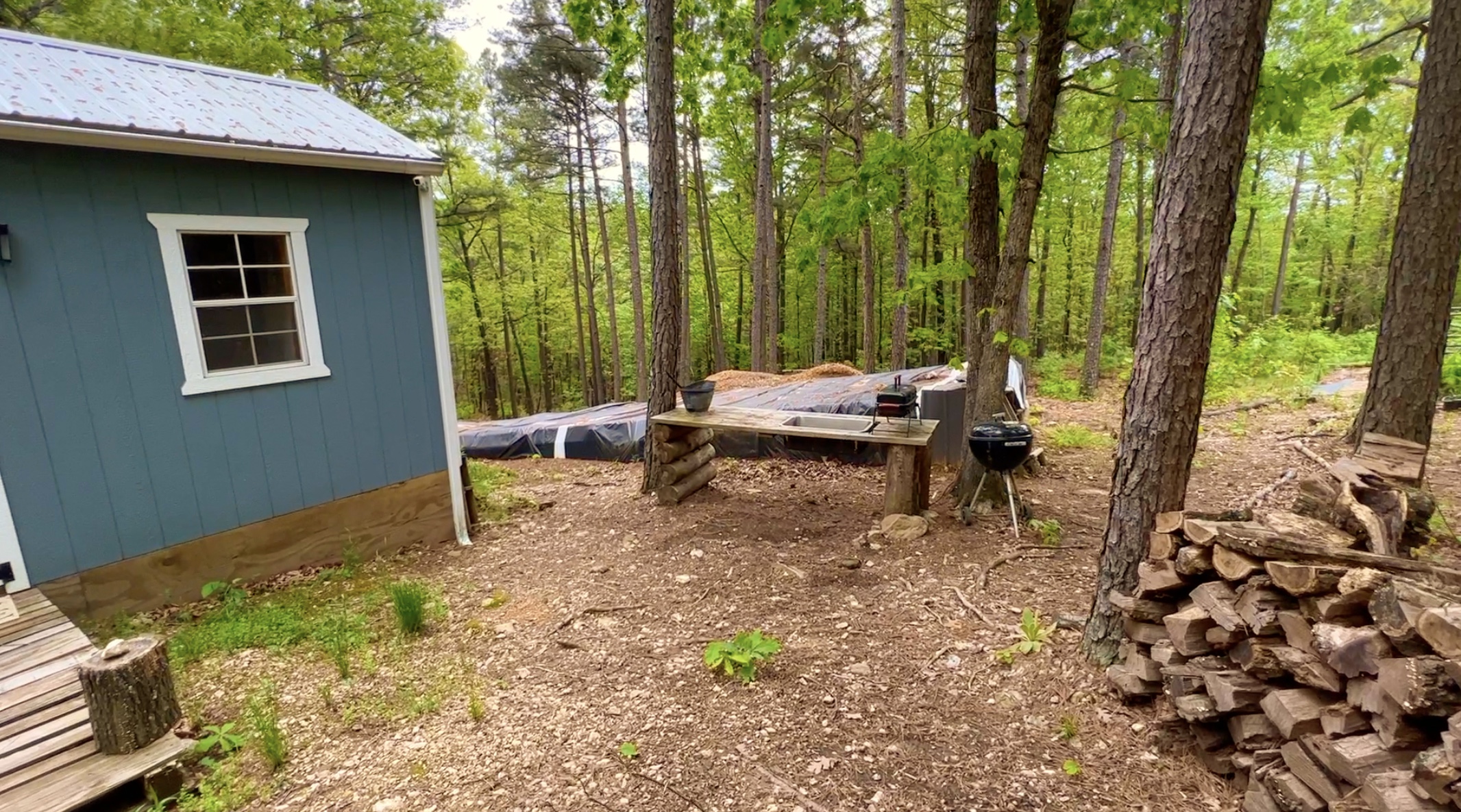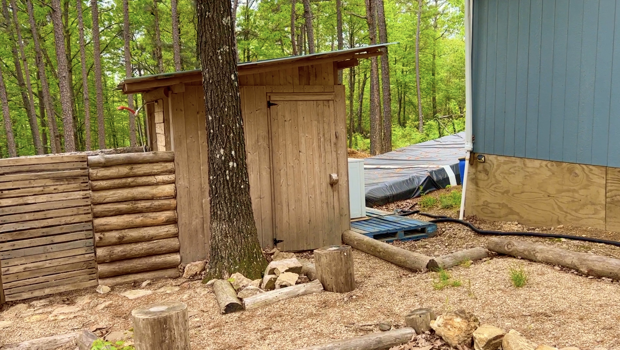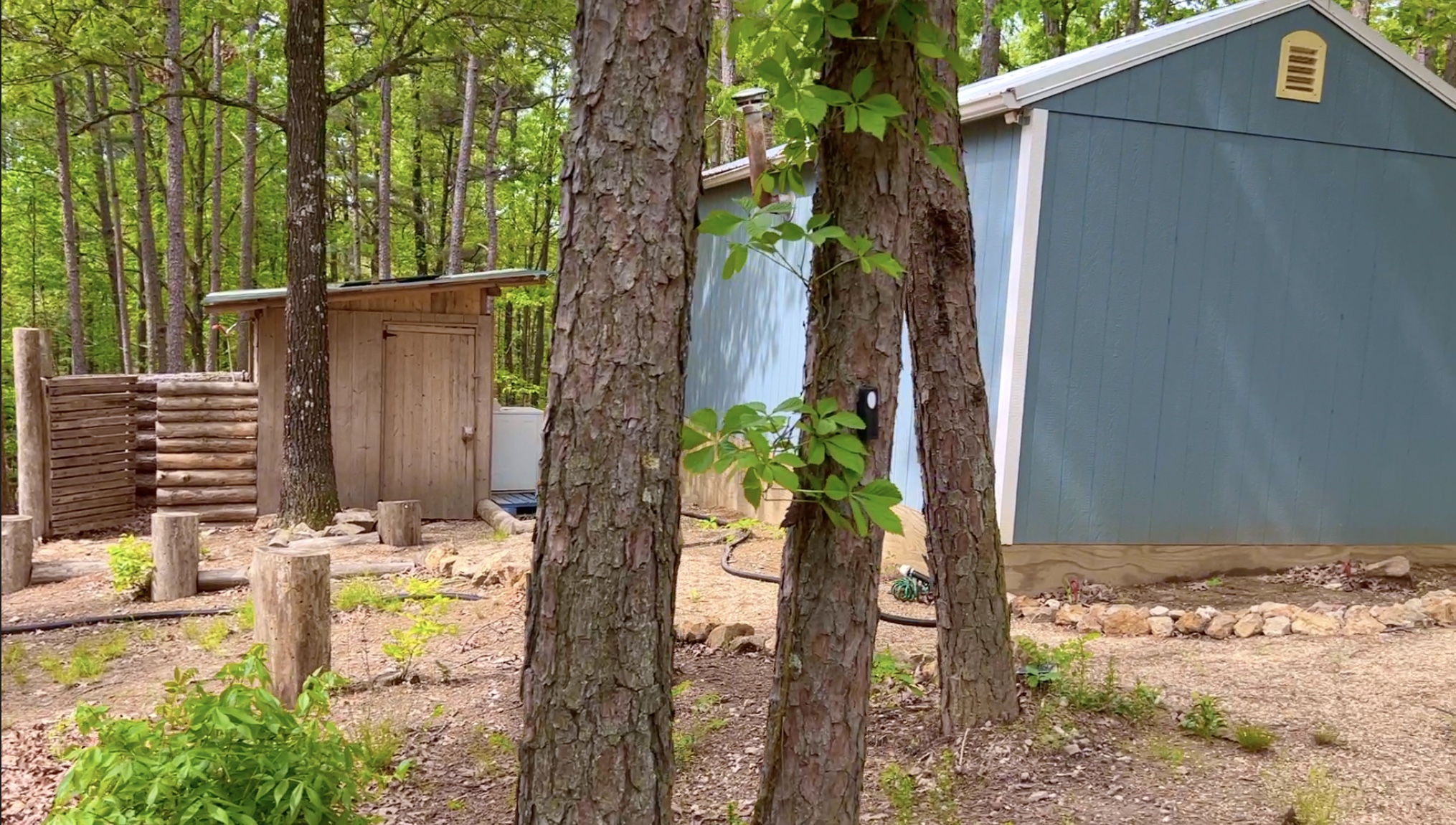 In the photo above we are looking at part of the “backyard” behind the cabin. The cabin is the blue structure on the right and the smaller structure on the left is an outdoor shower area (with an enclosed privacy area constructed of pine logs) and a detached bathroom area.