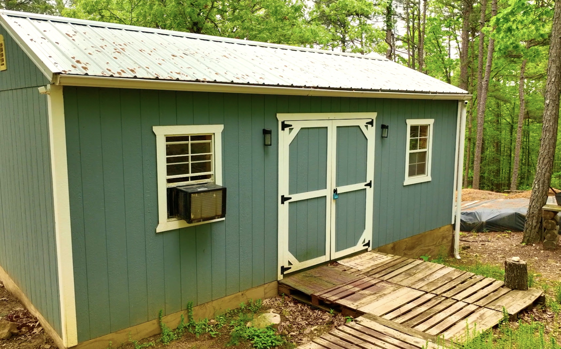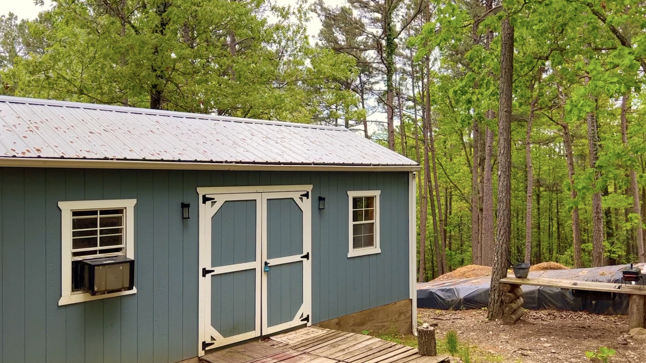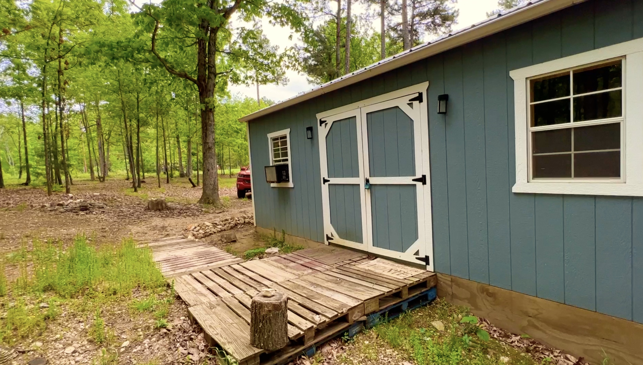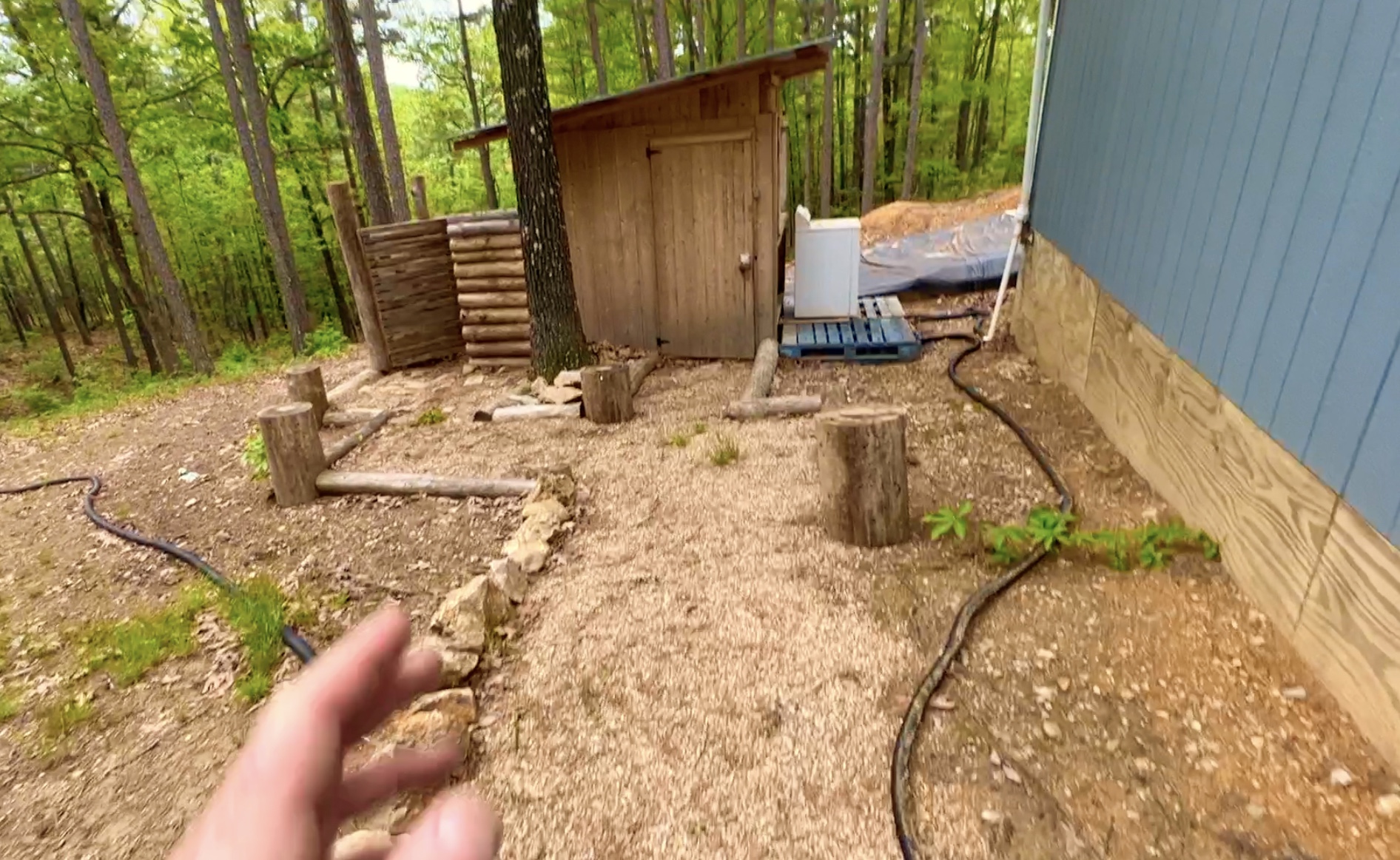 In the photo above we are looking at part of the “backyard” behind the cabin. The cabin is the blue structure on the right and the smaller structure on the left is an outdoor shower area (with an enclosed privacy area constructed of pine logs) and a detached bathroom area.