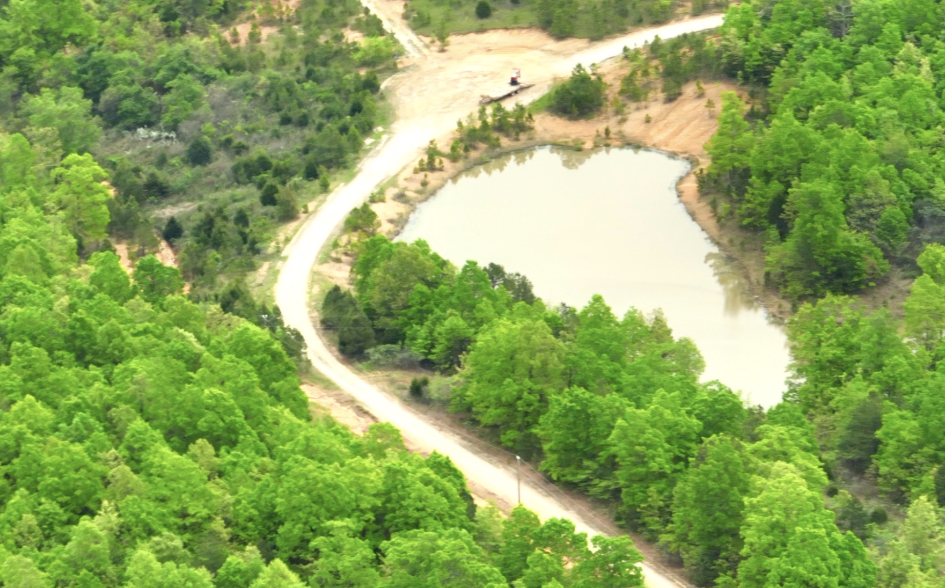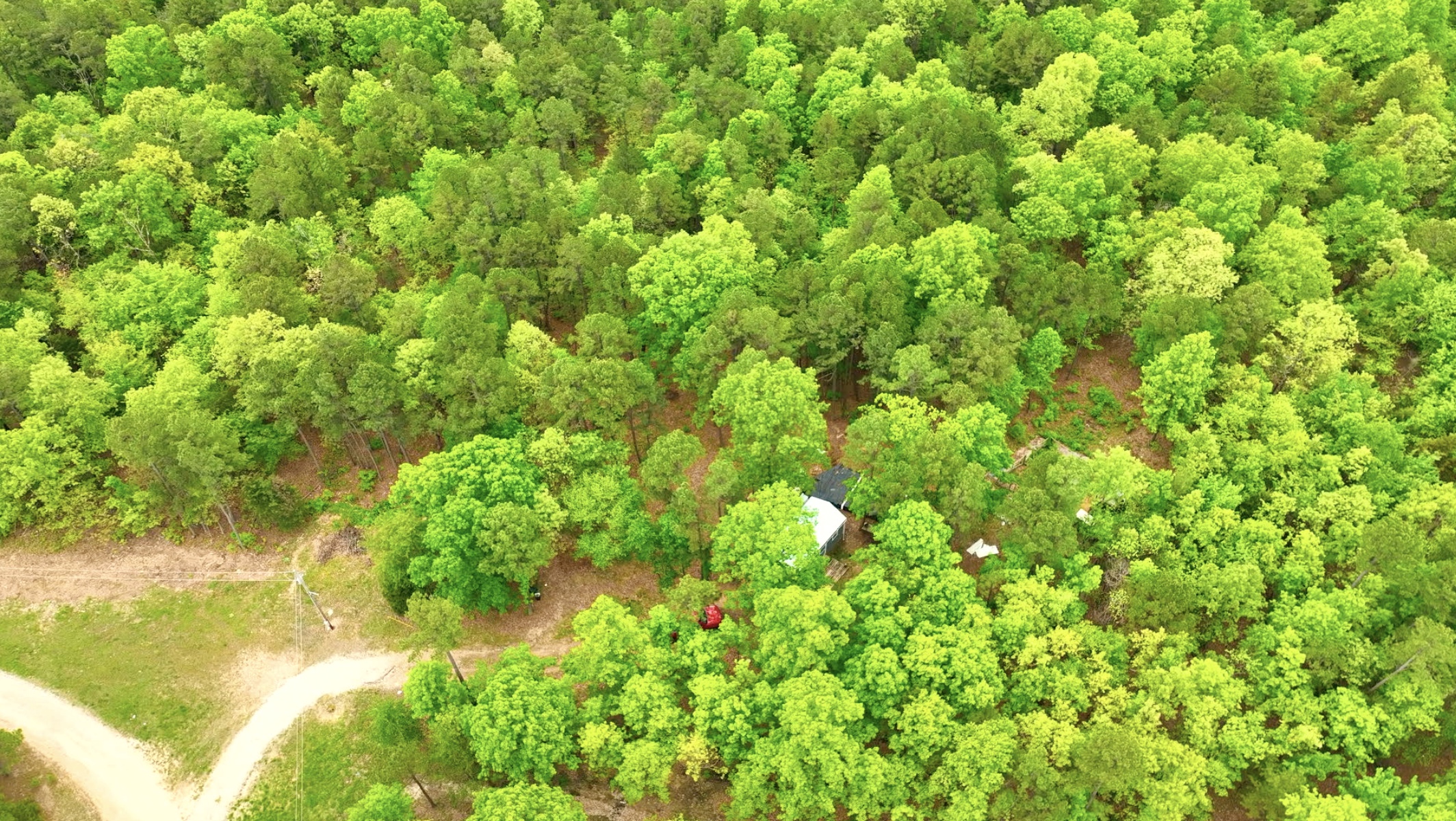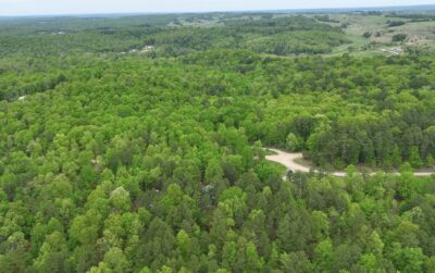 The aerial photo above gives you a “bird’s eye view” of this heavily wooded acreage. In the photo the drone is over about the middle of the property and we are facing north. The roof of the cabin is just barely visible through the large trees. In the photo you can see a small bit of Sargent Road (which is mostly hidden by trees) and you can see the Easement Road which comes off of Sargent Road and goes east (right) down to the pond.
