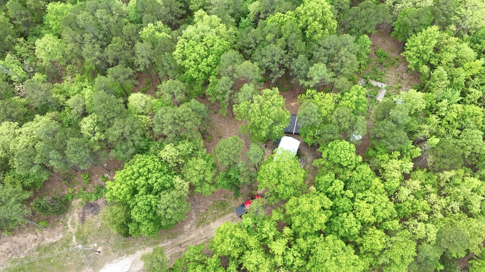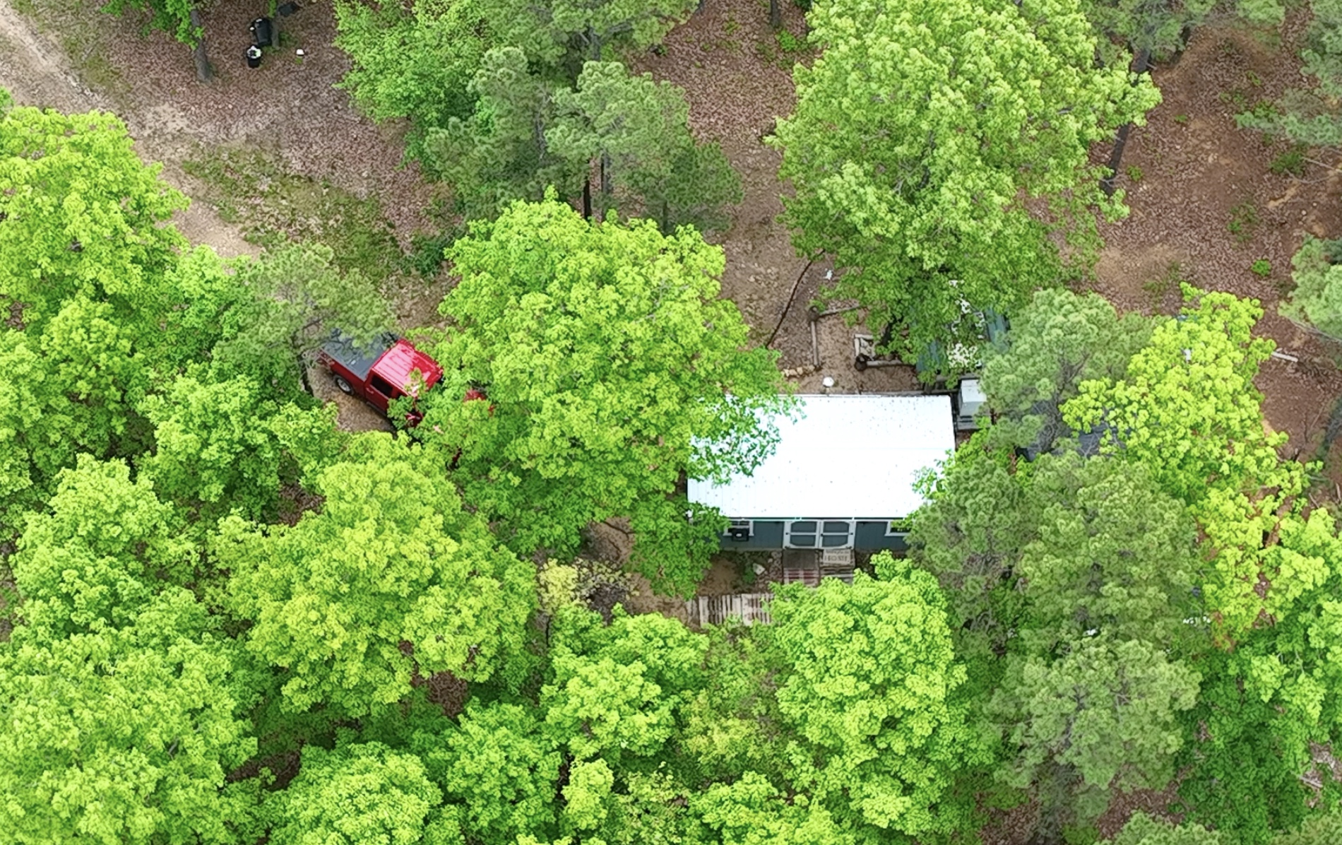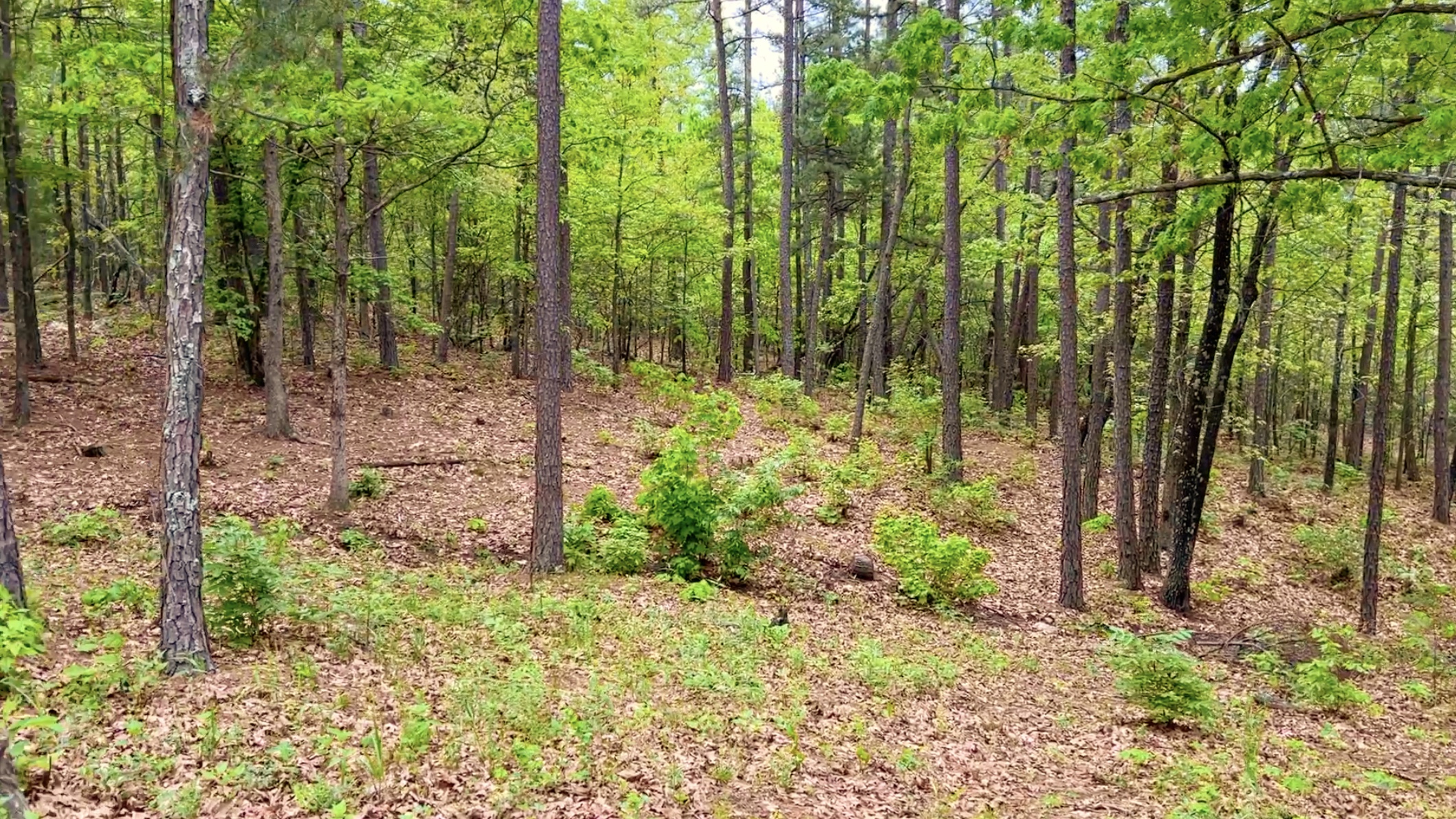On this property you find find many species of trees which may include pine, red oak, white oak, hickory, sycamore, walnut and more. The yard area around the cabin appears to contain a large number of very tall pine trees. In the photo above we are looking at a few of the trees behind the cabin (on the right you can see part of the outdoor shower).