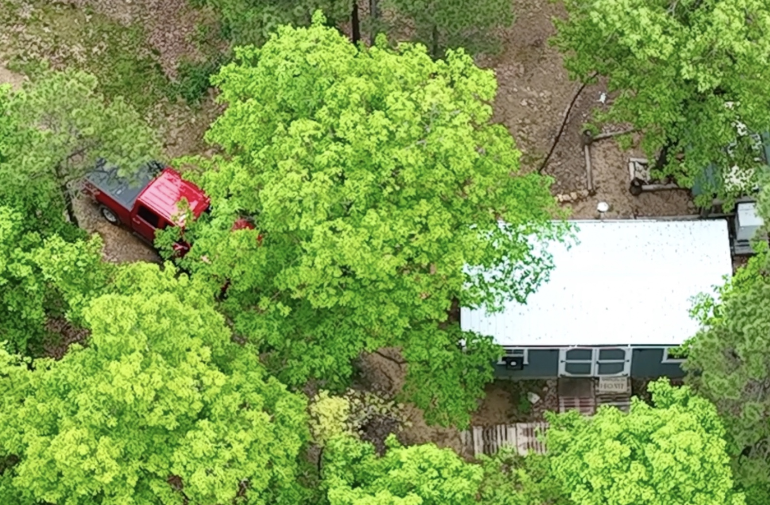 In the aerial photo above we are looking down at the cabin and the yard area around the cabin. Because of the large amount of mature timber on the property, the cabin itself as well as the yard area have a nice amount of shade during the heat of the summer days. Toward the upper right corner of the photo above you can see part of the “garden area” that is shown in the previous photo. The black “structure” just past the cabin is the roof of the large root cellar.