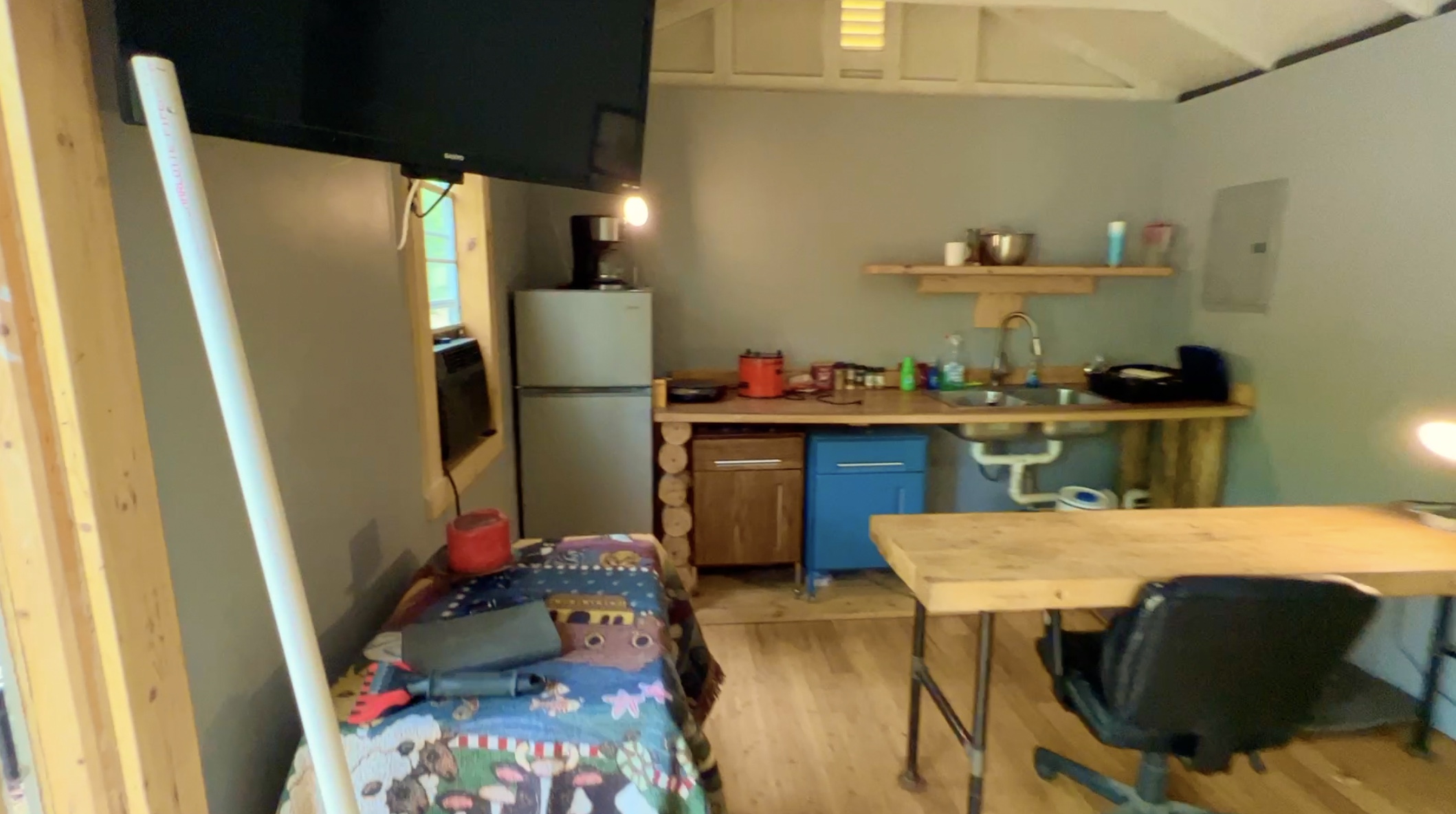 In the photo above we are looking at the “East Half” of the cabin. You can see the little kitchen area which appears to have a refrigerator as well as a sink. If you look at the wall on the right you can see the breaker box which serves the cabin.