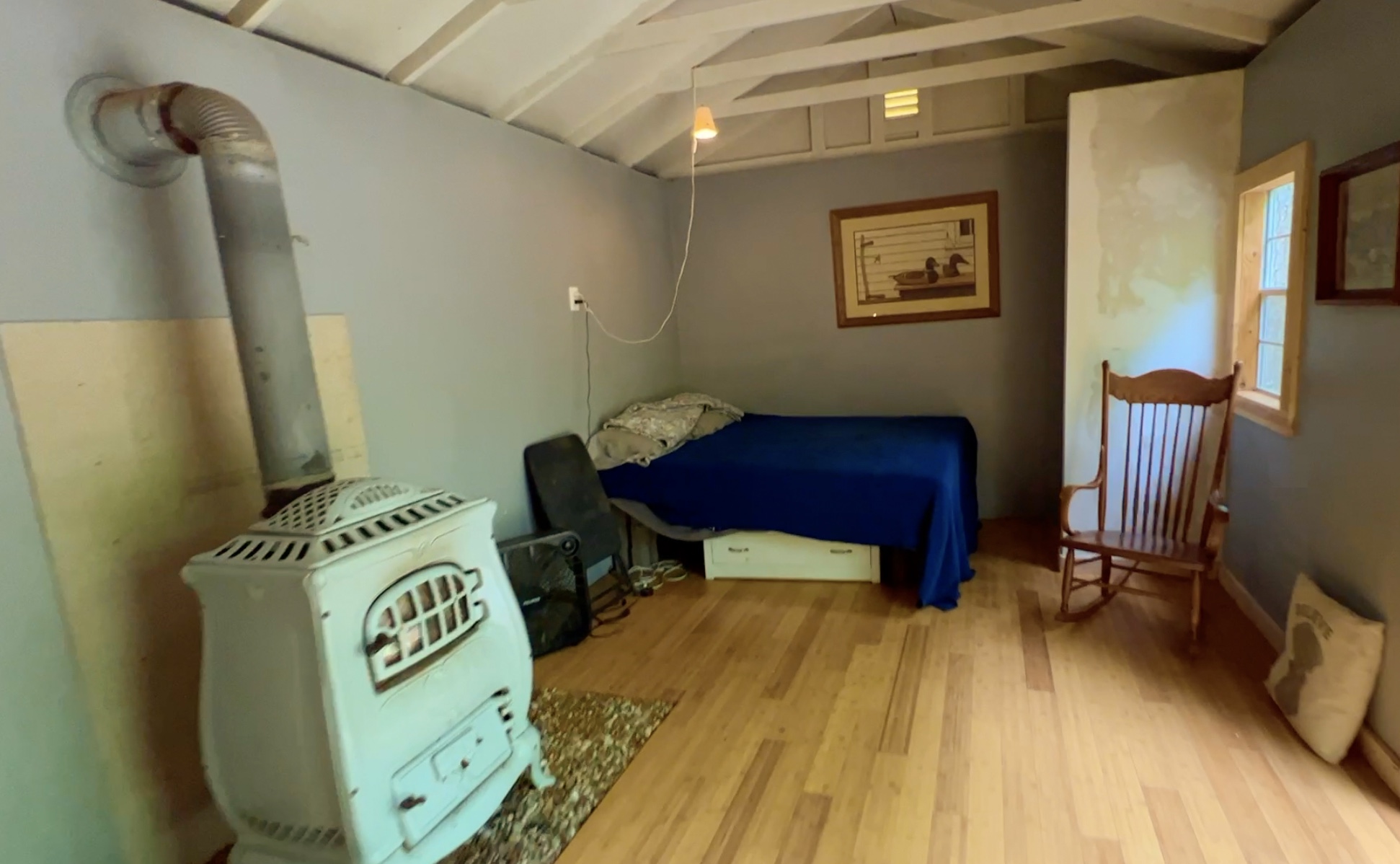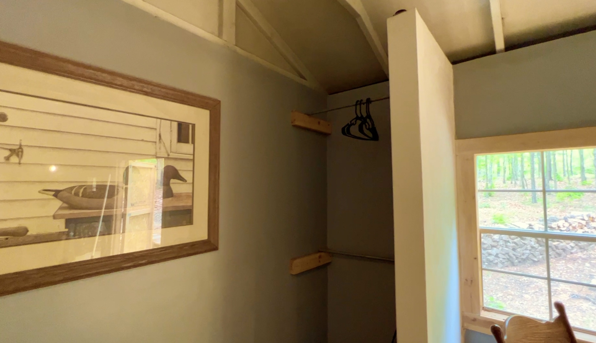 The photo above shows the “West Half” of the cabin which includes the bedroom area and a closet area. Some of the furniture/items in the photos and videos remain in the cabin including the bed and the wooded kitchen table shown in one of the previous photos. The rocking chair in the photo above was removed as were some other small personal effects.
