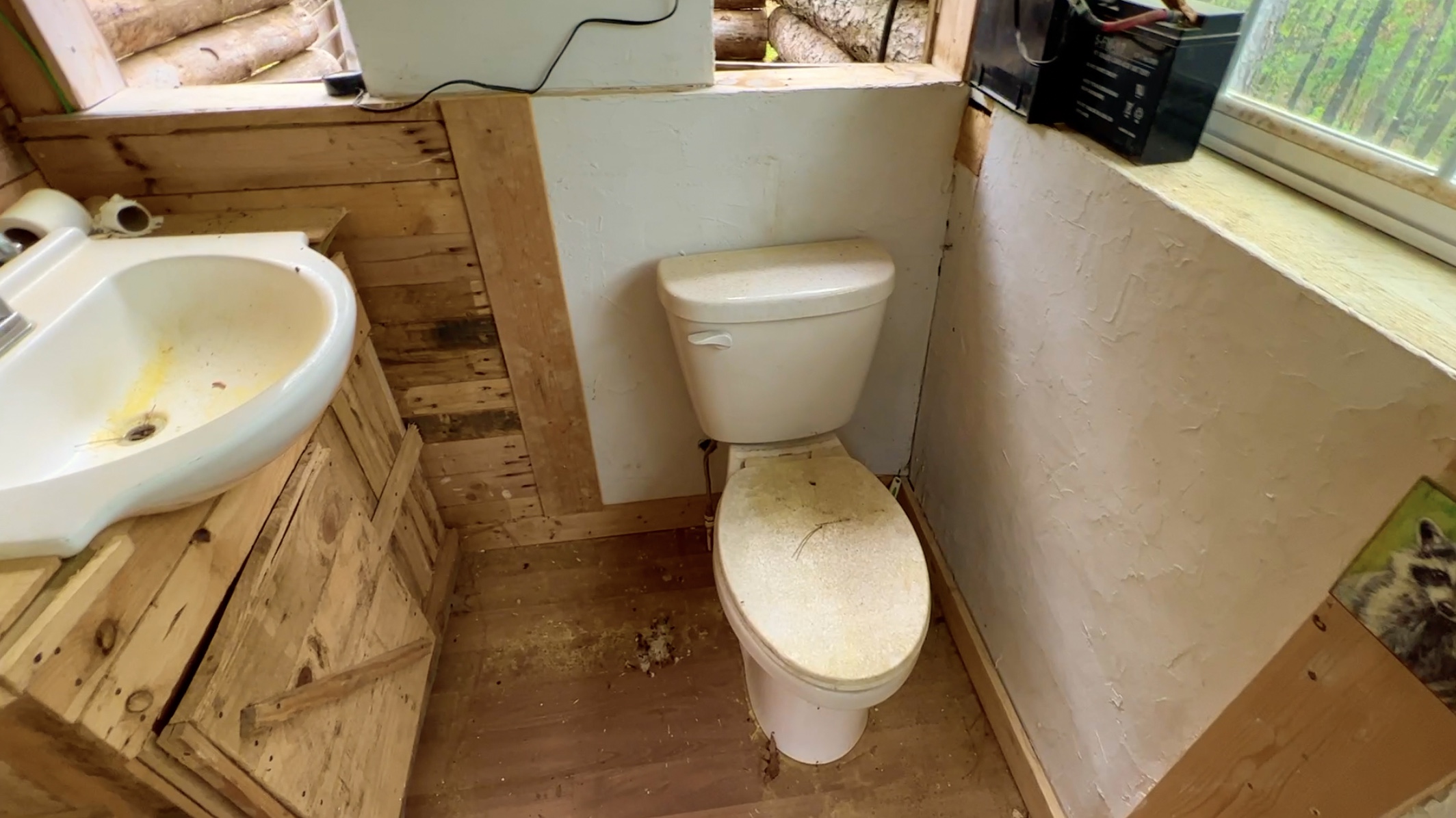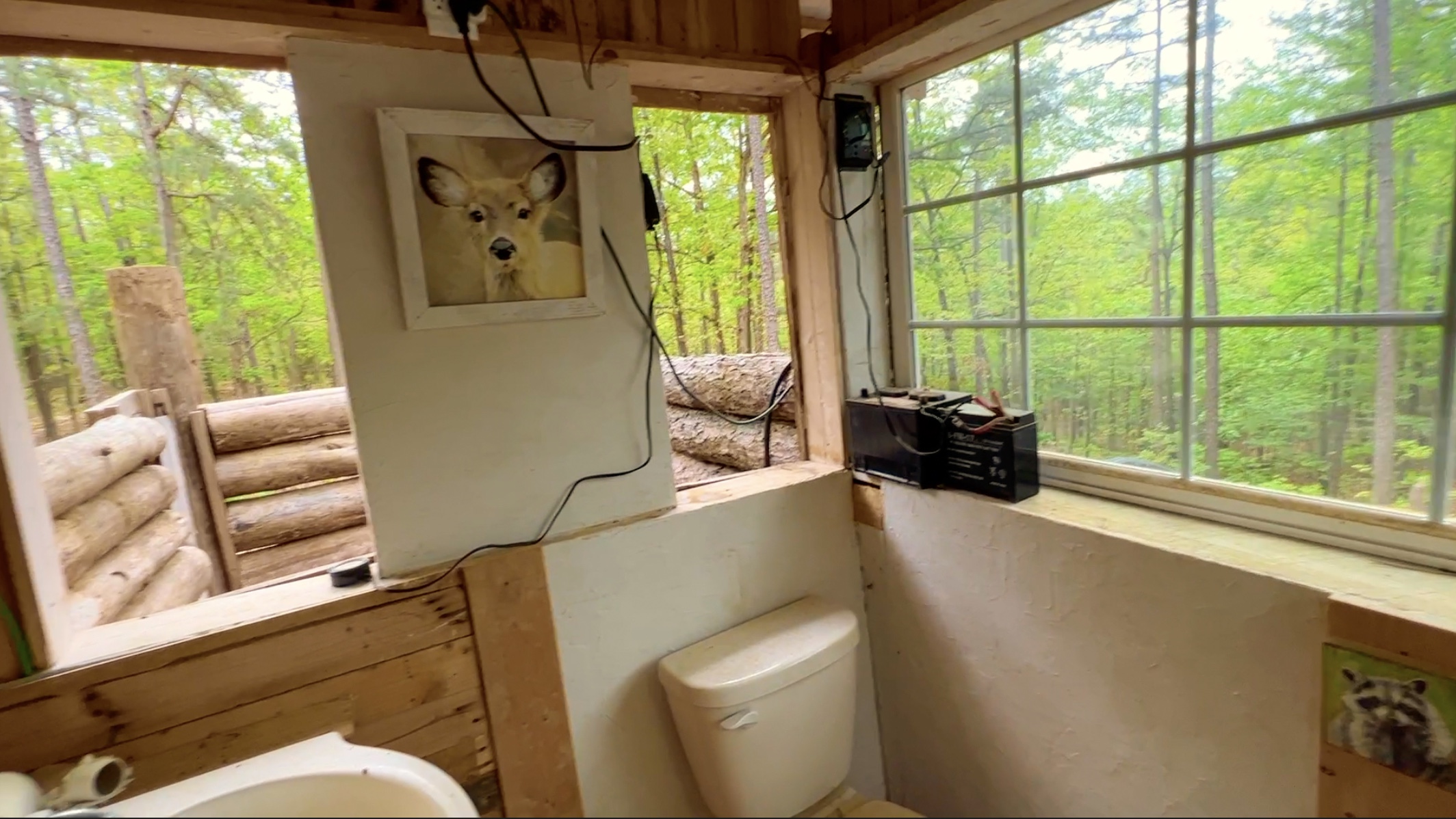 On the other side of the wall from the outdoor shower you will find the detached bathroom area which includes a toilet and a sink. There is a large window on one side of the detached bathroom and two of the other sides appear to have large open areas which were probably intended to be open in the summer and covered in the winter. Although the detached bathroom does not appear to have been used for quite some time, there is actually a small functioning solar power system within the bathroom.