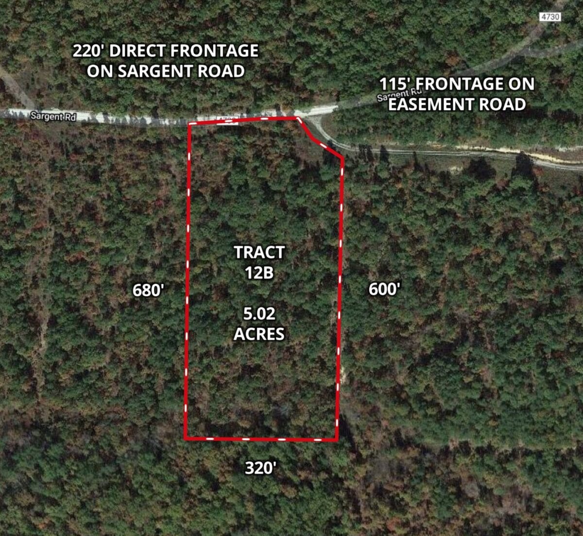 The information (below) is the specific information about this tract, which is Tract 12B at “The Tracts At Pine Ridge”. It is about 5.02 acres in size and it borders the County Road (Sargent Road) along its north side as well as bordering the Easement Road along its northeast side (see the maps later in this listing to see how the property is situated).